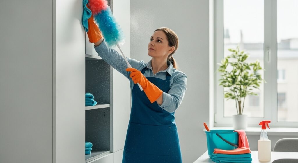 Thorough dusting of surfaces, furniture, and hard-to-reach areas to improve cleanliness and air quality.